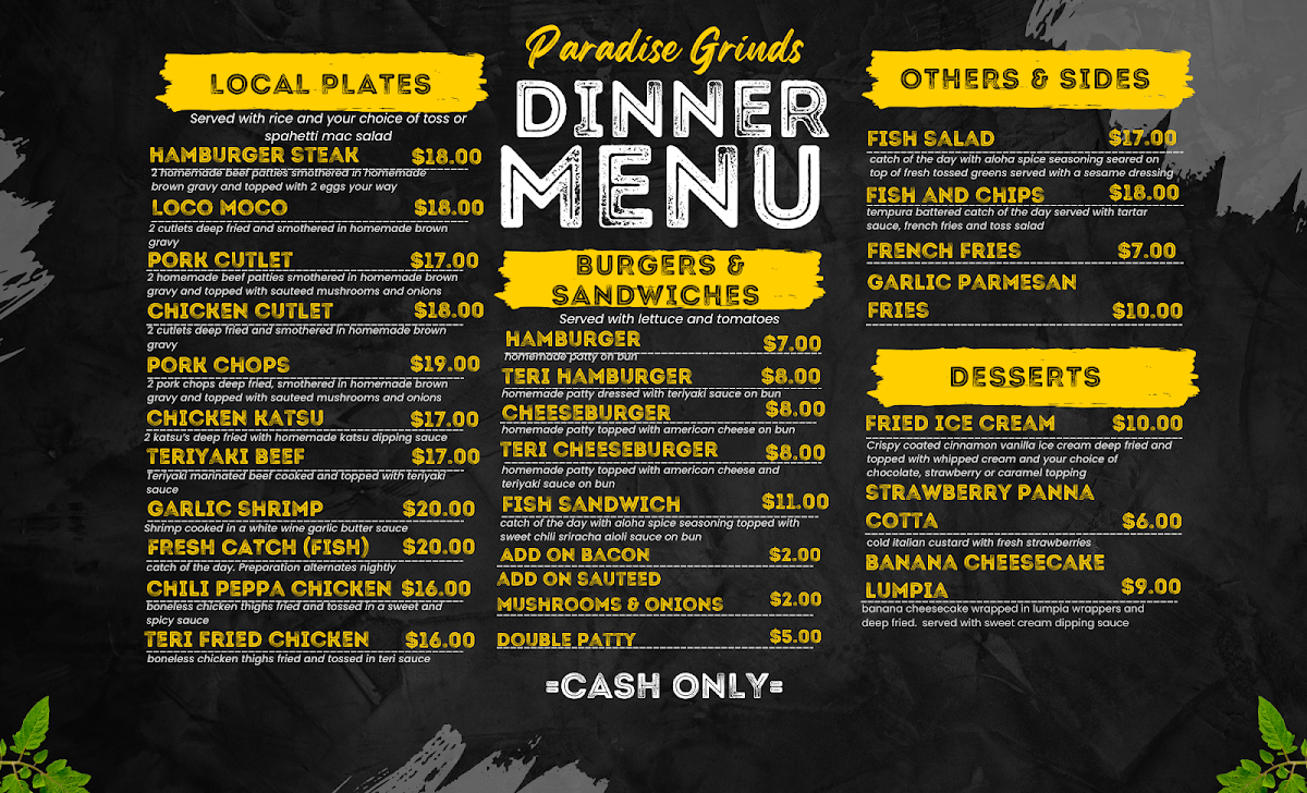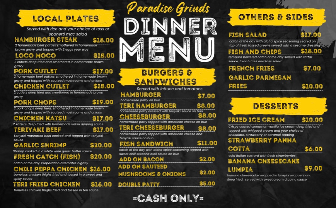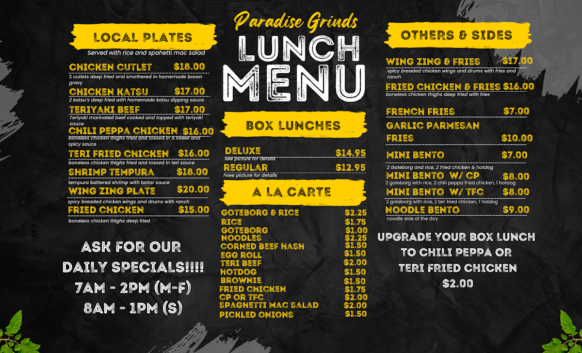 When you step into Paradise Grinds And Catering, you're in for a treat that brings the true flavors of Hawaii right to your plate. The menu is packed with mouth-watering options, from local classics to creative twists on island favorites. Whether you're in the mood for a savory poke bowl or a comforting plate lunch, there’s something here for everyone. As you dive into the options, the rich blend of tropical ingredients and bold spices will transport you straight to the islands. Don’t forget to check out their specialty catering options, perfect for any event. Paradise Grinds And Catering Menu promises a taste of aloha that you won’t soon forget. With every dish made fresh and served with a smile, this is the place where good food and good vibes meet.