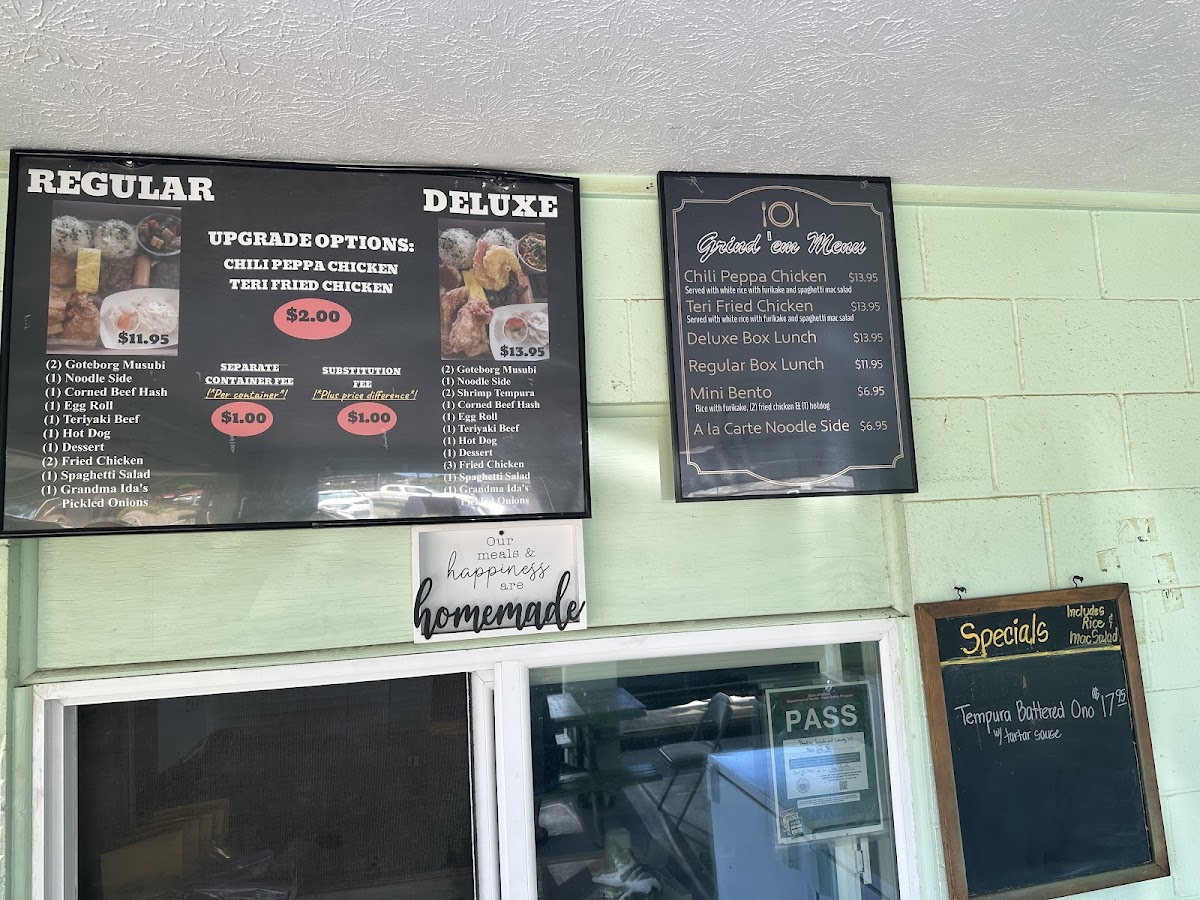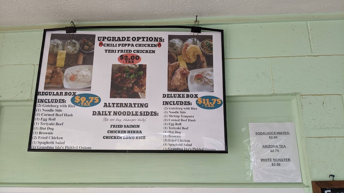 (2) Goteborg musubi, (1) noodle side, (2) shrimp tempura, (1) corned beef hash, (1) egg roll, (1) teriyaki beef, (1) hot dog, (1) dessert, (3) fried chicken, (1) spaghetti salad, (1) Grandma Ida's pickled onions.