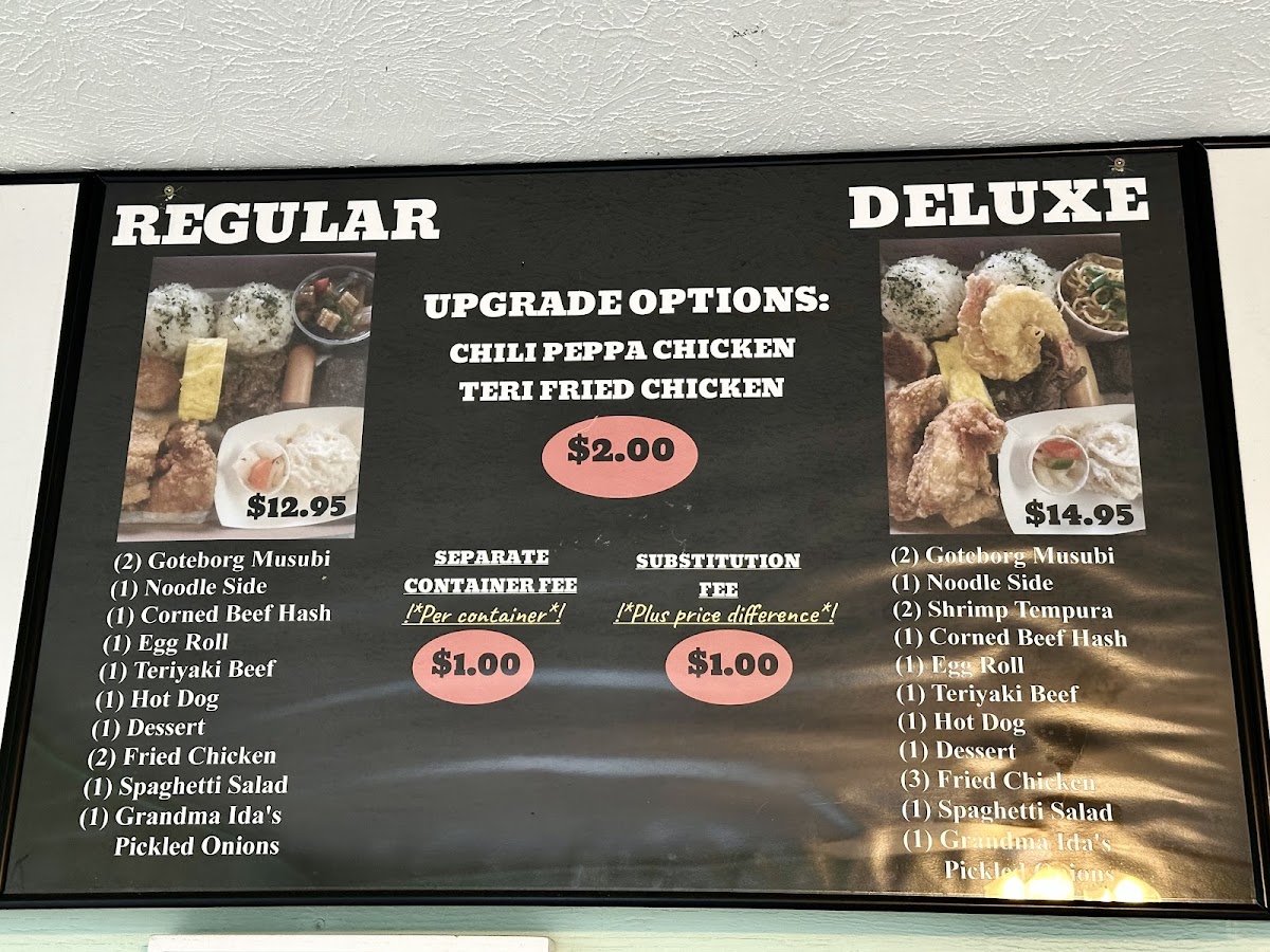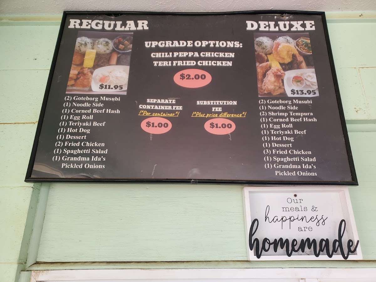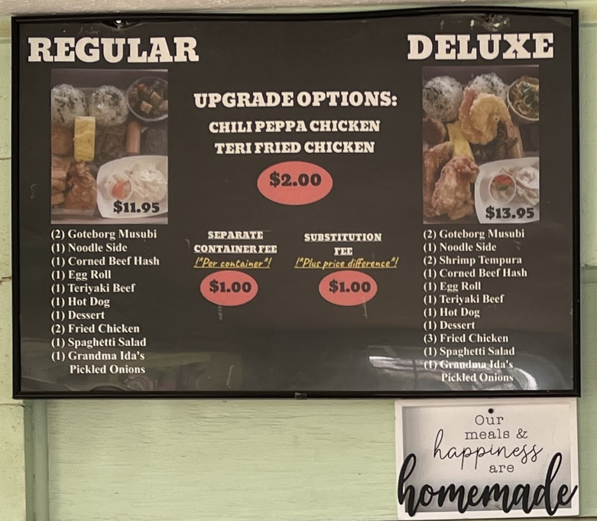 (2) Goteborg musubi, (1) noodle side, (1) corned beef hash, (1) egg roll, (1) teriyaki beef, (1) hot dog, (1) dessert, (2) fried chicken, (1) spaghetti salad, (1) Grandma Ida's pickled onions.